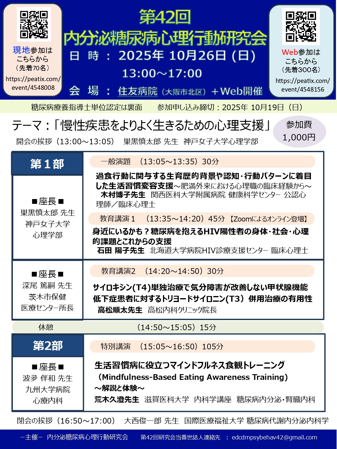 おかやま糖尿病サポーター更新研修会B 【ハイブリッド開催】第42回 内分泌糖尿病心理行動研究会 研修会名 【ハイブリッド開催】第42回 内分泌糖尿病心理行動研究会 開催日時 令和7(2025)年10月26日(日) 13:00~17:00 会場 ハイブリッド開催 住友病院 (大阪府大阪市北区中之島5-3−20) 対象者 医療従事者すべて(医師、看護師、管理栄養士、薬剤師、公認心理師など) 参加費 有料(1000円) 主催団体名 内分泌糖尿病心理行動研究会 問合せ先 波夛 伴和(九州大学病院 心療内科) E-mail:hata.tomokazu.780@m.kyushu-u.ac.jp プログラム(右の画像をクリックすると拡大表示されます) 備考 ・事前参加登録が必要です。申込方法はプログラムをご参照ください。 (掲載日:令和7(2025)年10月9日)