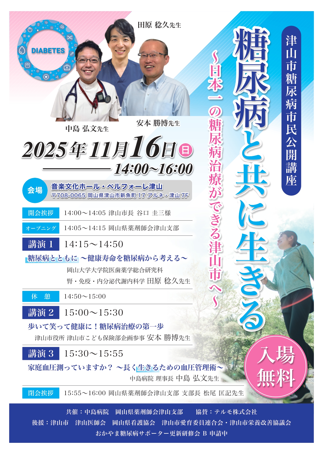 おかやま糖尿病サポーター更新研修会B 【会場開催】津山市糖尿病市民公開講座 研修会名 【会場開催】津山市糖尿病市民公開講座 開催日時 令和7(2025)年11月16日(日) 14:00~16:00 会場 音楽文化ホール・ベルフォーレ津山 (津山市新魚町17 アルネ津山7階) 対象者 一般市民・医療関係者・行政・看護学生 参加費 無料 主催団体名 医療法人社団和風会 中島病院 問合せ先 中尾 久美子(医療法人社団和風会 中島病院) TEL:0868-22-8251 (平日診療時間内のみ対応・木・土は午前のみ) プログラム(右の画像をクリックすると拡大表示されます) 備考 ・事前申込不要 ・当日おかやま糖尿病サポーターのカードを持参し、受付時にスタンプの押印を受けてください。 (掲載日:令和7(2025)年10月9日)