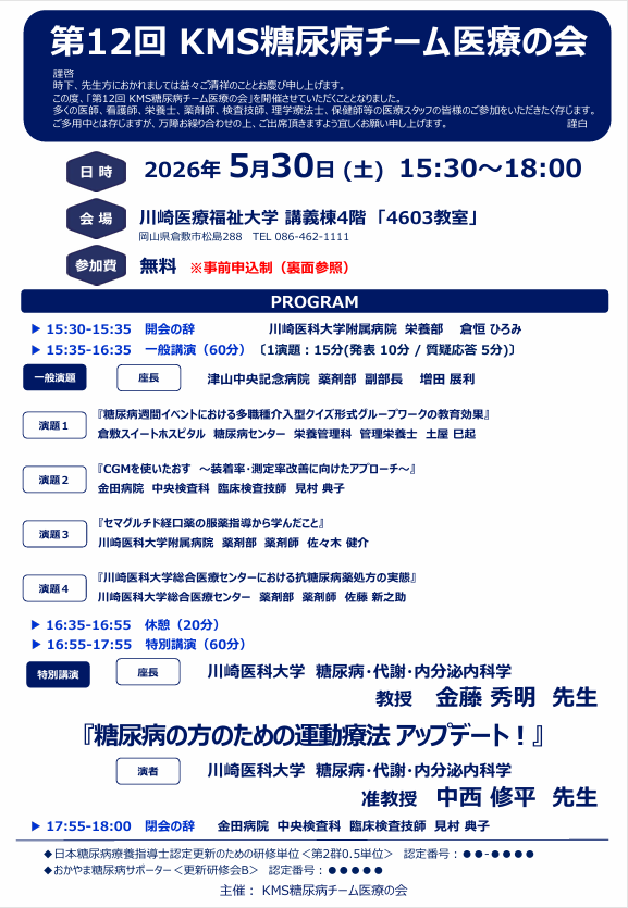 おかやま糖尿病サポーター更新研修会B 【会場開催】第12回KMS糖尿病チーム医療の会 研修会名 【会場開催】第12回KMS糖尿病チーム医療の会 開催日時 令和8(2026)年5月30日(土) 15:30~18:00 会場 川崎医療福祉大学 講義棟4階「4603教室」 (岡山県倉敷市松島288) 対象者 医師、薬剤師、看護師、管理栄養士 など 参加費 無料 主催団体名 KMS糖尿病チーム医療の会 問合せ先 下田 将司 (川崎医科大学 糖尿病・代謝・内分泌内科学) E-mail:tounai@med.kawasaki-m.ac.jp プログラム(右の画像をクリックすると拡大表示されます) 備考 ・事前申込必要、当日参加可 ・申込み方法はプログラムをご参照ください ・当日おかやま糖尿病サポーターのカードを持参し、受付時にスタンプの押印を受けてください。 (掲載日:令和8(2026)年4月14日)