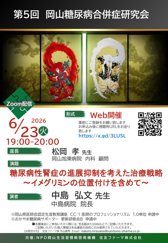 おかやま糖尿病サポーター更新研修会B 【Web開催】第5回岡山糖尿病合併症研究会 研修会名 【Web開催】第5回岡山糖尿病合併症研究会 開催日時 令和8(2026)年6月23日(火) 19:00~20:00 会場 Web(オンライン)開催 対象者 医師、看護師、管理栄養士、薬剤師、臨床検査技師、理学療法士 参加費 無料 主催団体名 NPO岡山生活習慣病啓発機構・住友ファーマ株式会社 問合せ先 平山 真琴 (住友ファーマ株式会社 西日本営業部東中国営業所) E-mail:makoto.hirayama@sumitomo-pharma.co.jp プログラム(右の画像をクリックすると拡大表示されます) 備考 ・事前参加申込が必要です。申込方法はプログラムをご参照ください。 (掲載日:令和8(2026)年4月14日)