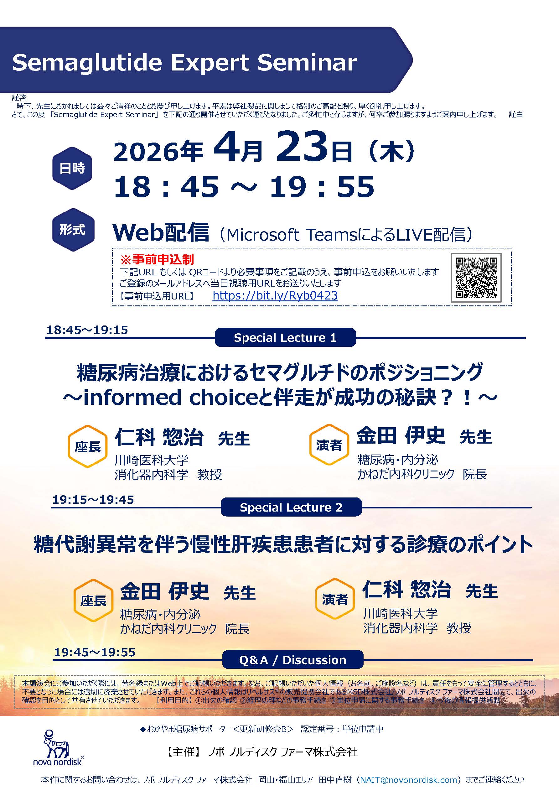 おかやま糖尿病サポーター更新研修会B 【Web開催】Semaglutide Expert Seminar 研修会名 【Web開催】Semaglutide Expert Seminar 開催日時 令和8(2026)年4月23日(木) 18:45~19:55 会場 Web(オンライン)開催 対象者 医師、薬剤師、看護師、栄養士 など 参加費 無料 主催団体名 ノボノルディスクファーマ株式会社 問合せ先 田中 直樹(ノボ ノルディスク ファーマ株式会社) E-mail:NAIT@novonordisk.com プログラム(右の画像をクリックすると拡大表示されます) 備考 ・事前参加登録が必要です。申込方法はプログラムをご参照ください。 (掲載日:令和8(2026)年2月26日)